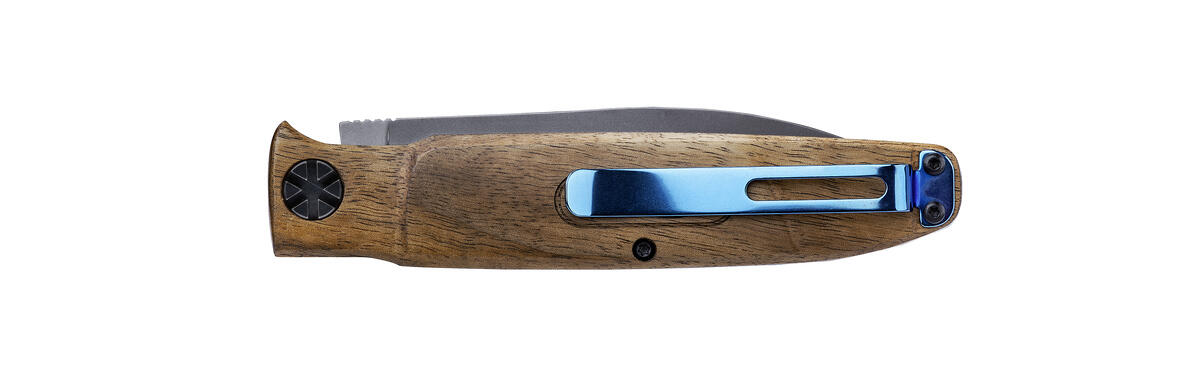 Păstrați-l la birou sau luați-l în natură – în orice mod, Blue Wood Knife 5 este un partener de încredere. Clasicul nail-nick vă permite să îl deschideți cu ușurință. Mecanismul slipjoint are o oprire de 90 °. Datorită designului subțire este foarte comod de purtat în buzunar. Iată un instrument elegant, de care vă puteți folosi în orice situație – grătar sau activități în aer liber. Lama placată cu titan este fabricată din oțel 440C cu o retenție ridicată a muchiei. Clema albastră și plăselele din lemn de nuc, adaugă o notă de culoare care amintește de apa care se grăbește. Este inclusă o teacă de piele pentru transportul opțional al briceagului BWK 5, pe centură.