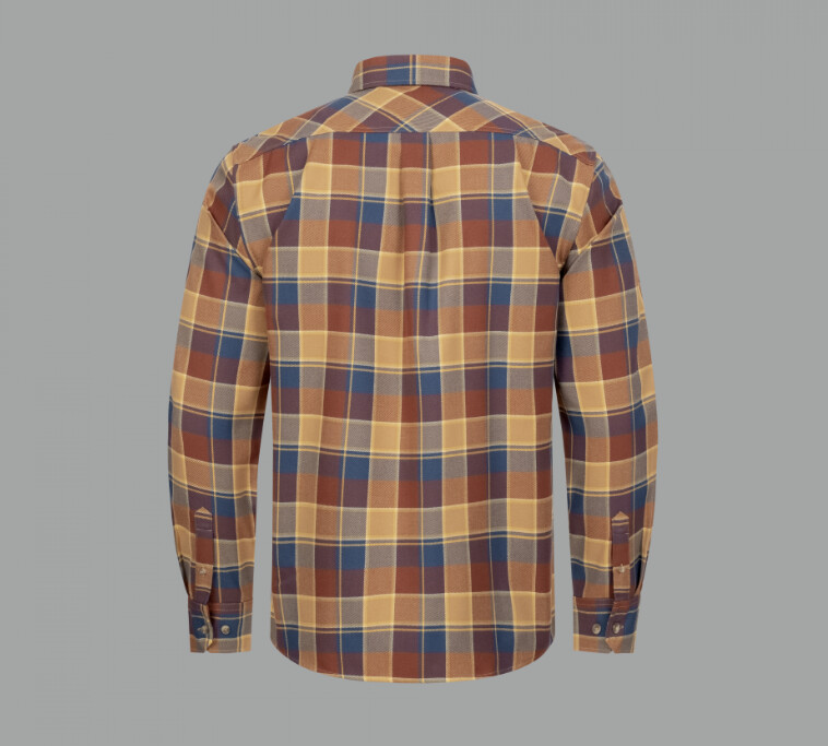 Cămașă de flanel cu mânecă lungă, realizată din amestec de fire de bumbac/poliester. În exterior, piersic pentru o atingere mai moale, 1 buzunar superior, guler cu nasturi și detalii cu branding Blaser pe buzunar și pe clapa inferioară din față.