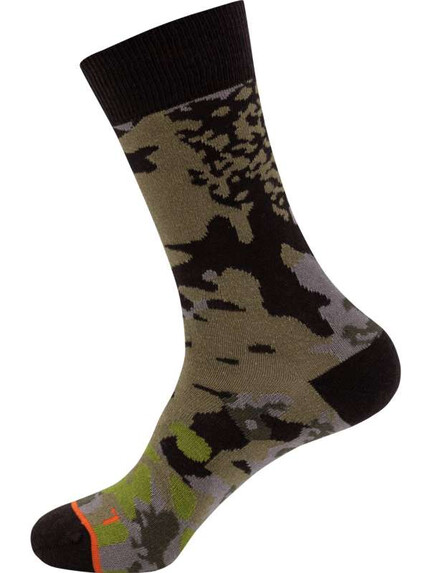 Șosetele sunt disponibile în HunTec Camo și în negru, cu zone contrastante verzi ale degetelor și călcâiului.