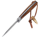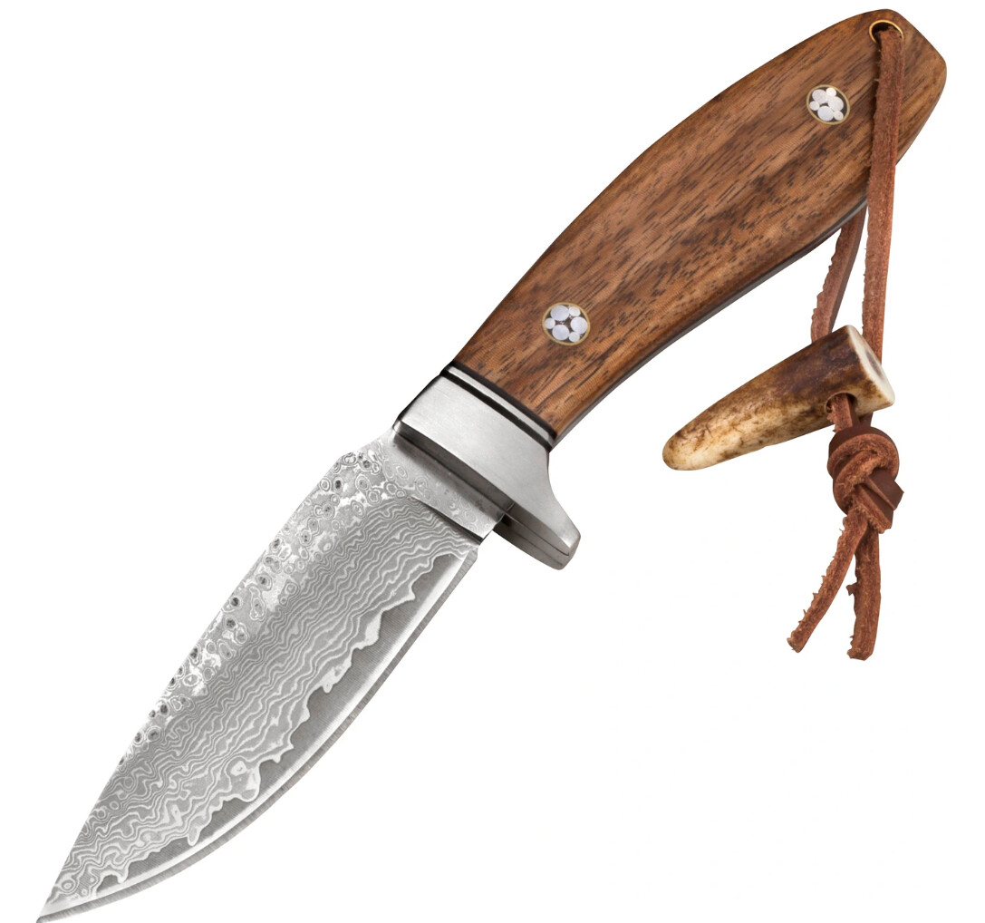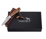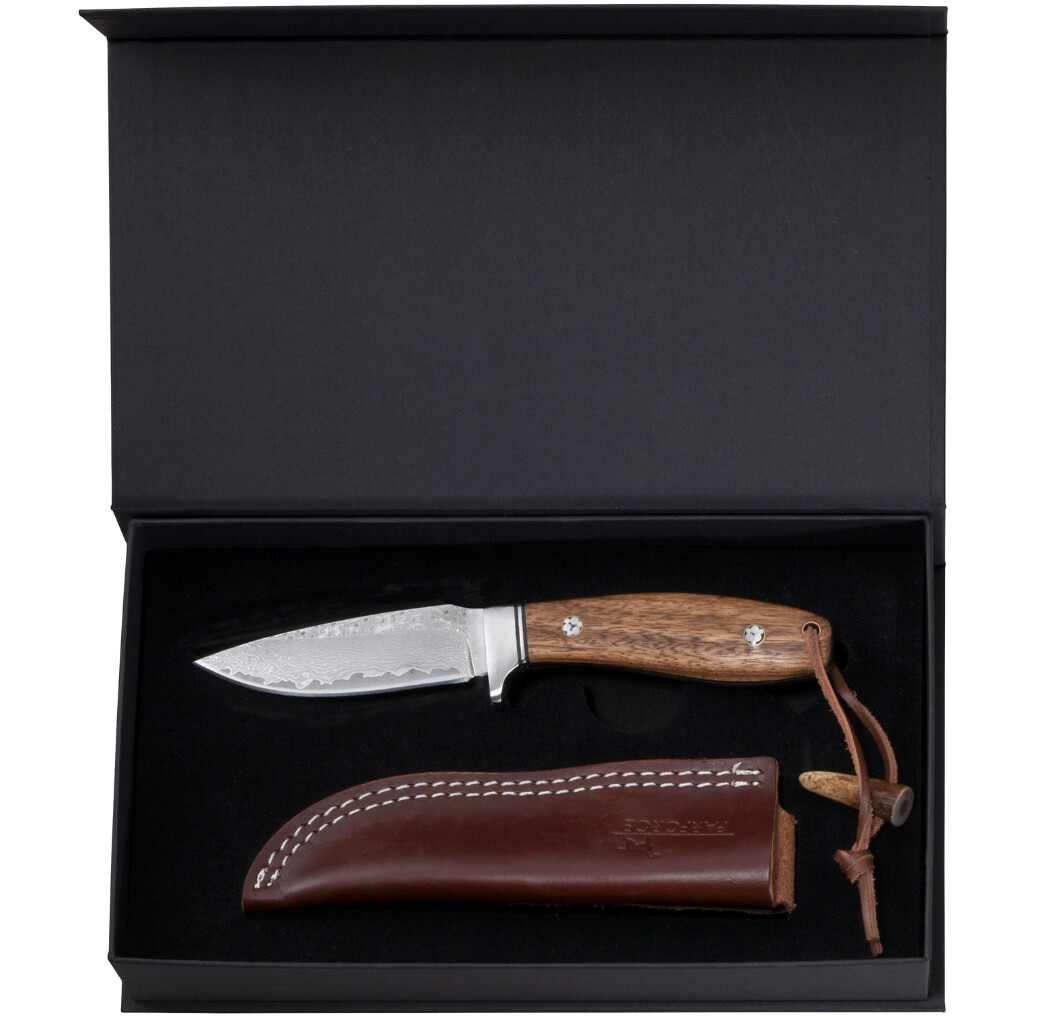 Cuțitul Parforce Damasc Gavilan nu doar este ascuțit perfect, are design-ul lamei de vitrină sau are teaca ce atrage atenția. Este un partener fidel pentru utilizarea de zi cu zi. Forma neobișnuită asigură o poziție excelentă a mâinii datorită curburii ușoare a mânerului și sprijinului pentru degetul mare de pe spatele lamei. Lama lungă de 9,1 cm este realizată în stil Damasc. Garda pronunțată din oțel inoxidabil, care, la fel ca cântarul mânerului din lemn de zebră cu incrustații negre contrastante din G10, asigură siguranță. O altă atracție vizuală sunt niturile decorative și orificiul pentru șnur din alamă pentru șnur din piele cu zăvor cu corn. Inclusiv teaca din piele de inalta calitate cu cusaturi de contrast dublu si o cutie cadou nobila.