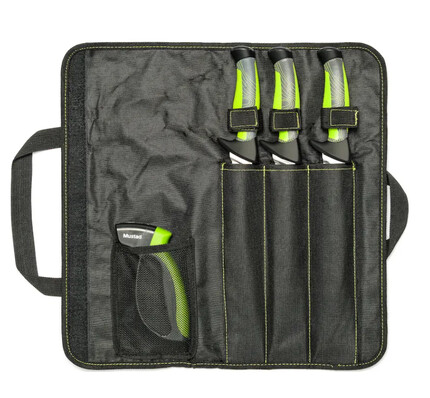 Sunt incluse cuțitele de file de 7"" și 8"" și cuțitul de dezosat de 9"", menținându-vă pregătit pentru orice dimensiune de pește. Aceste lame din oțel fabricație germană inoxidabil sunt alegerea ideală pentru rezistență excelentă la coroziune și pentru filetat. Pentru a menține lamele întreținute și gata. pentru următoarea captură, setul de cuțite include un ascuțitor de mână cu aceeași ergonomie bine concepută ca și cuțitele.O husă rulantă ține cuțitele împreună și protejate, în timp ce sunteți în mișcare.