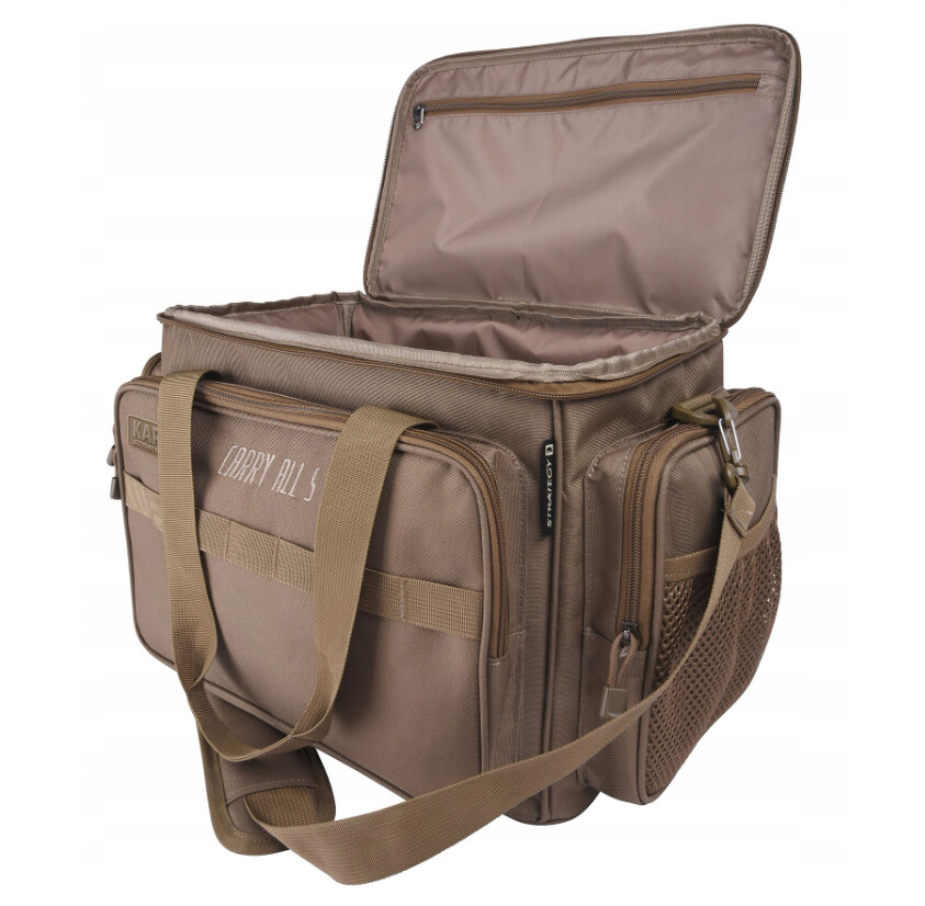 Cea mai mare geanta de echipamente din gama Strategy Karki, care poate transporta o multitudine de accesorii pentru pescuitul crapului, campare sau pungile de boilies cu proteine. Karki Carryall Large are un compartiment principal foarte spatios, precum si patru buzunare exterioare inchise cu fermoar dublu. Fiecare buzunar include un buzunar din plasă elastică, iar în plus, bucle elastice sunt situate pe buzunarele din față. Geanta este realizata din poliester intr-o culoare moderna kaki maro. O curea de umăr reglabilă și două mânere fac transportul mult mai ușor.